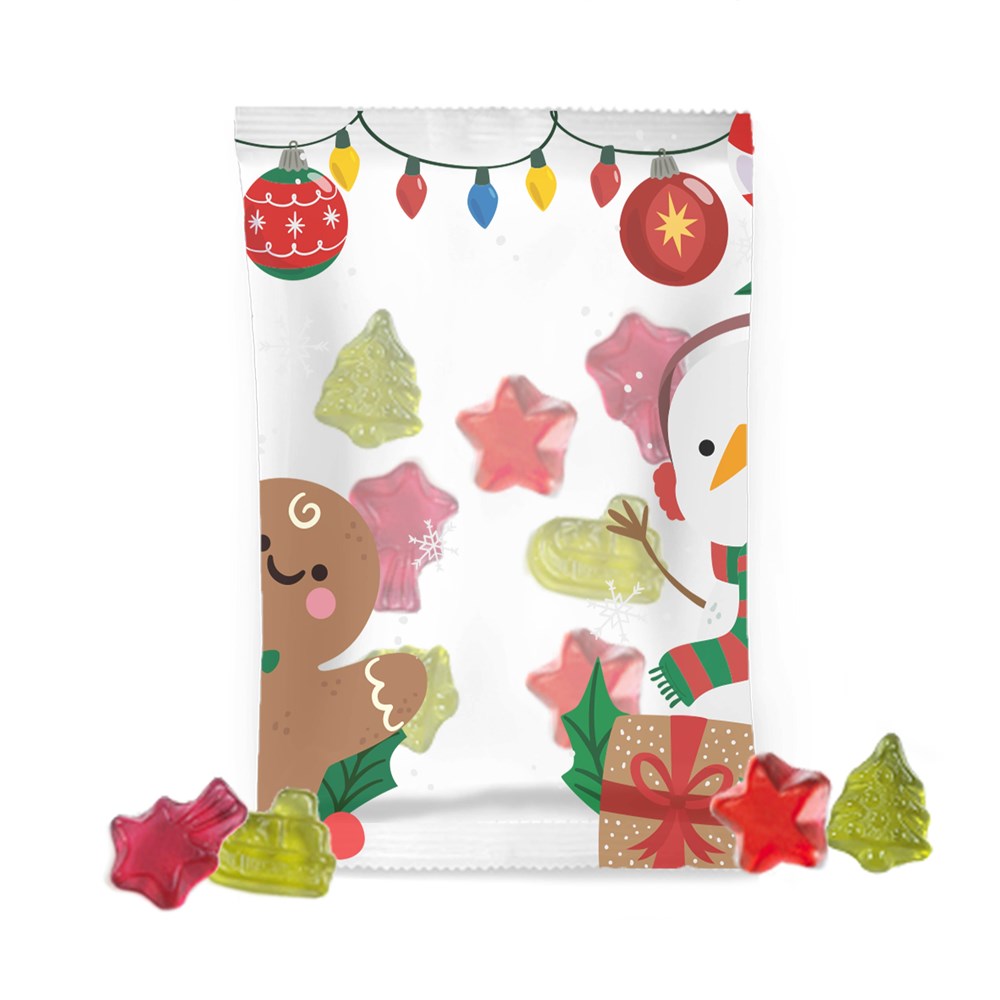 Vruchtengummies Kerst in transparante folie, ca. 10 gr. vruchtengummies in assorti kleuren en smaken