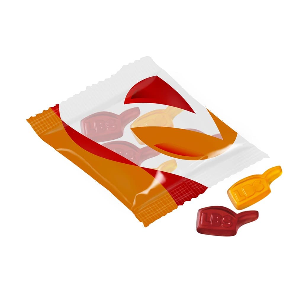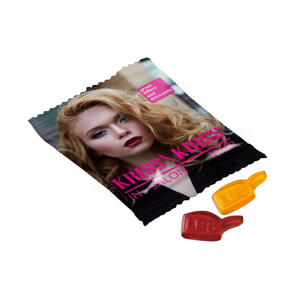 Vruchtengummies special in transparante folie, ca. 10 gram vruchtengummies in eigen vorm en in assorti kleuren en smaken. Eenmalige malkosten 1250,-