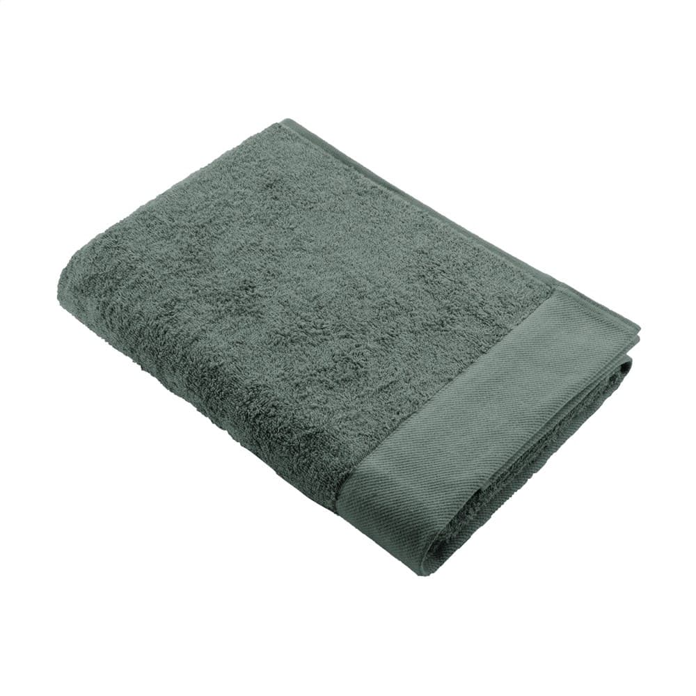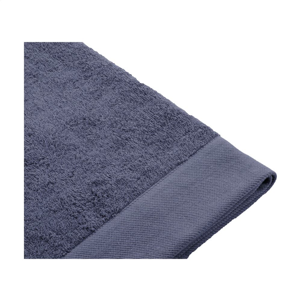 Stijlvolle badhanddoek van het merk Walra. Gemaakt van 70% gerecycled katoen en 30% katoen (550 g/m²). De badhanddoek heeft een fijne structuur, een elegante boord en een handige ophanglus. Heerlijk zacht, goed absorberend en duurzaam. Dit product is Oeko-tex en GRS gecertificeerd. Met de productie van dit badtextiel wordt, door hergebruik van materialen, veel water, CO2-uitstoot en energie bespaard. Dit wordt bevestigd door het onafhankelijk REMO keurmerk. Perfect voor handdoeken bedrukken.