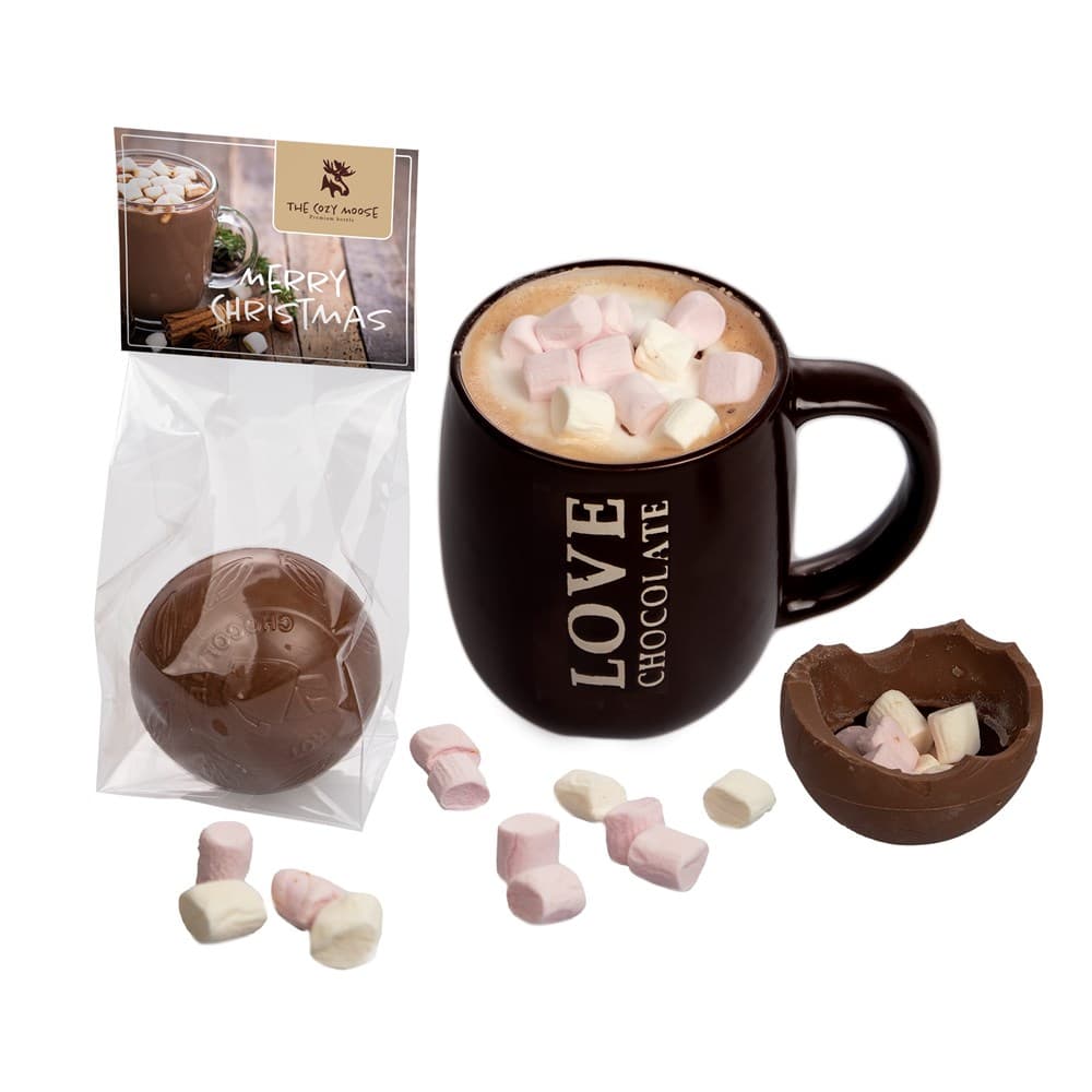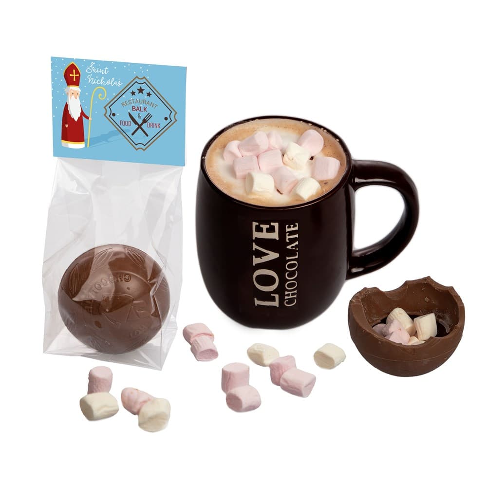 Transparant blokzakje met full colour bedrukt kopkaartje, gevuld met een chocolademelk bal met mini marshmallows