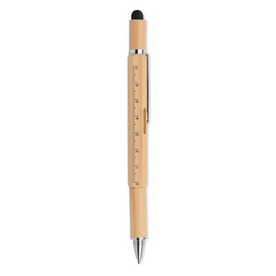 Waterpaspen van bamboe met draaimechanisme, 7 cm liniaal, stylus en kruiskop- en platte schroevendraaierbits. Blauwe inkt. Bamboe is een natuurlijk product, de kleur per artikel kan verschillen.