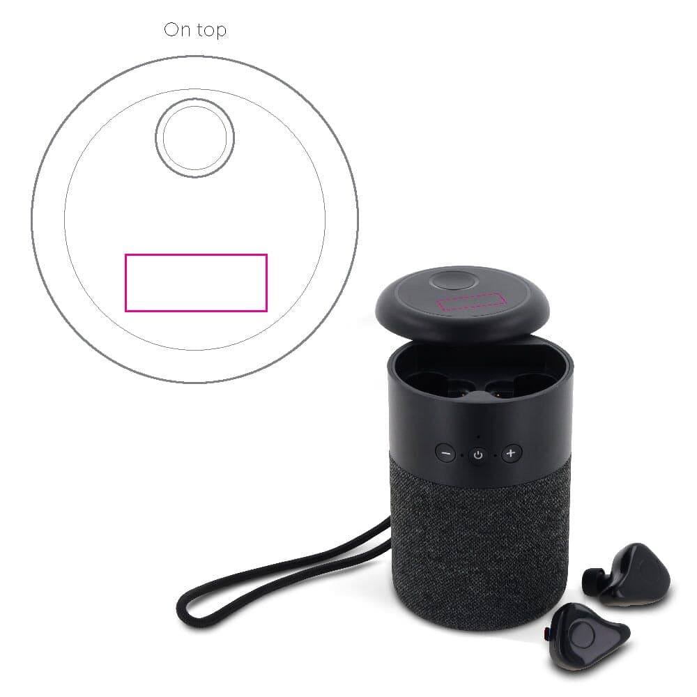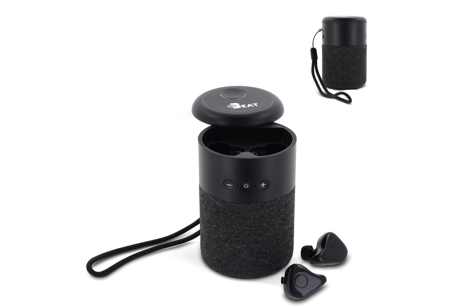 Draadloze speaker met een paar draadloze oordopjes die geschikt zijn om op verschillende manieren naar muziek te luisteren. Dit 2-in-1 audiogeschenk zorgt ervoor dat je op elk moment op verschillende manieren naar muziek kunt luisteren.