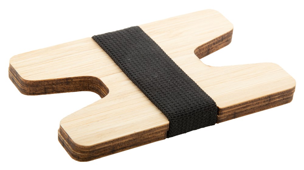 Bamboe multiplex creditcard houder met elastische rubberen band.
