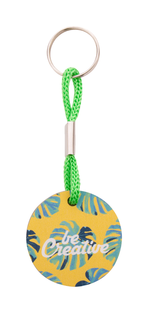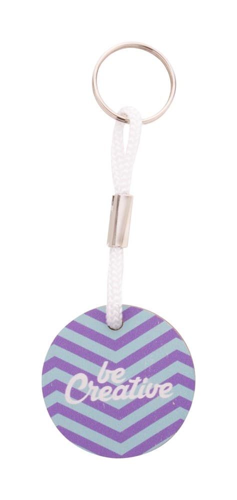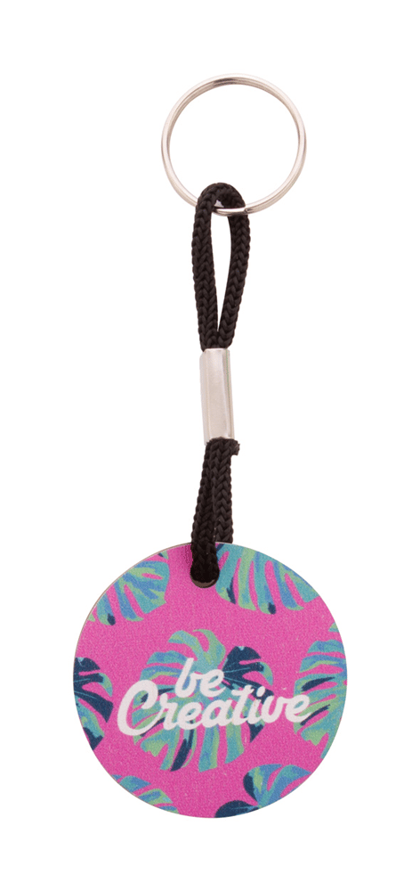 Ronde sleutelhanger van berken multiplex met gekleurd polyester koord en full colour bedrukking. Prijs is inclusief UV-LED-bedrukking aan één zijde. MOQ: 200 stuks.
