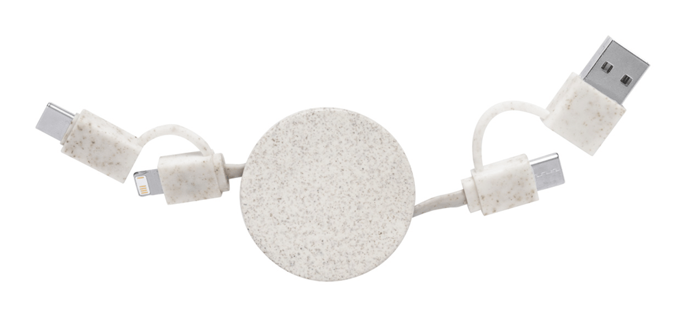 Telescopische USB-oplaadkabel in ecologisch tarwestro plastic. Met micro-USB-, USB-C- en Lightning-aansluitingen. Met USB- en USB-C-ingangen.