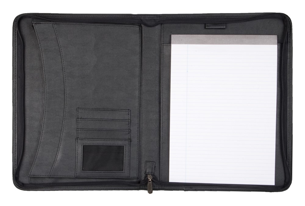 Leren A4 schrijfmap. Bevat gelinieerd notitieblok, penhouder, documentenhouder en vistitekaarthouder.