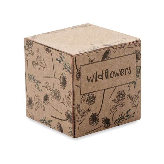 Zaadbom kweekset gepresenteerd in kartonnen doos. Inclusief wilde bloemen mix zaden. Gemaakt in EU.