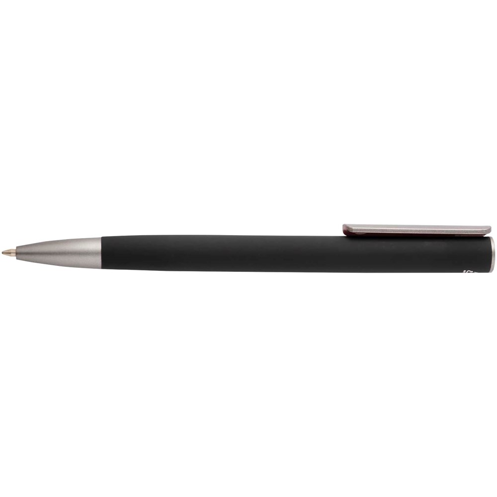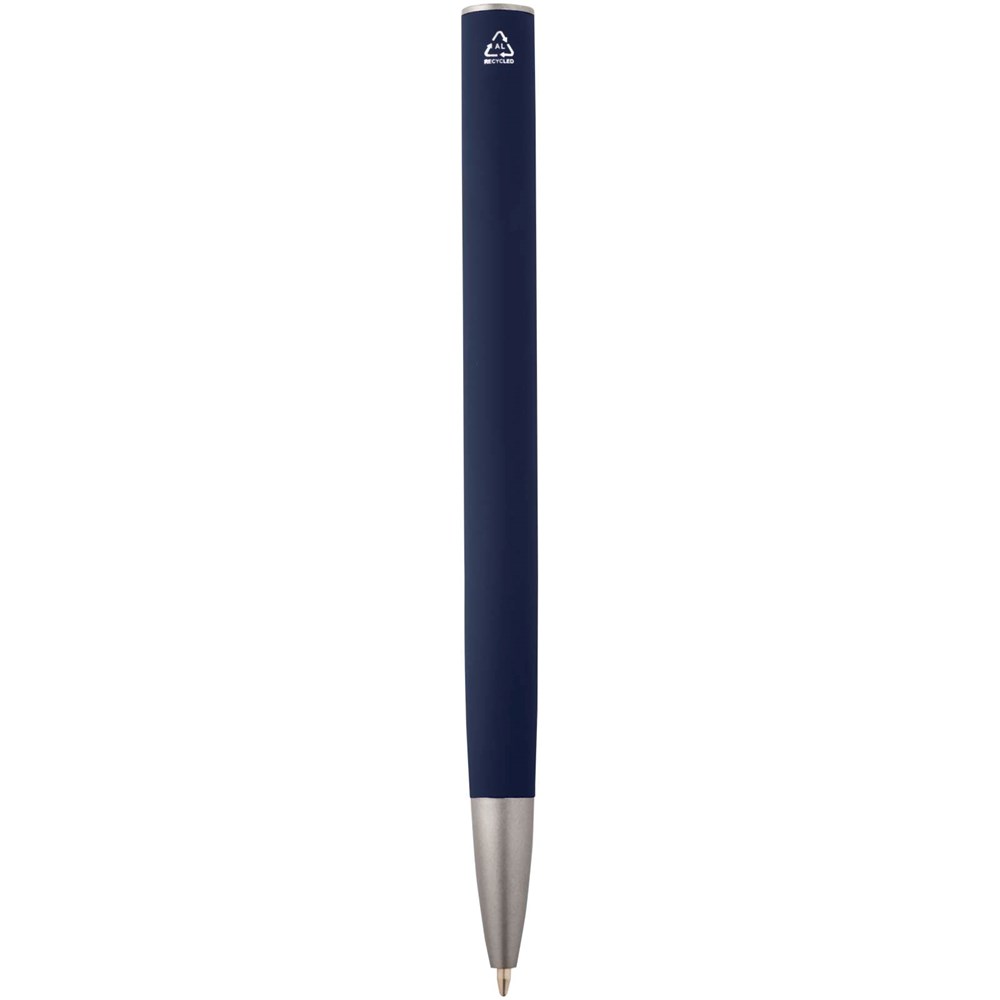 Balpen met een houder van gerecycled aluminium en een zilverkleurige clip van ABS-plastic. Inktkleur: Blauw. Schrijflengte: 800 meter. Stiftmaat: 1,0 mm.